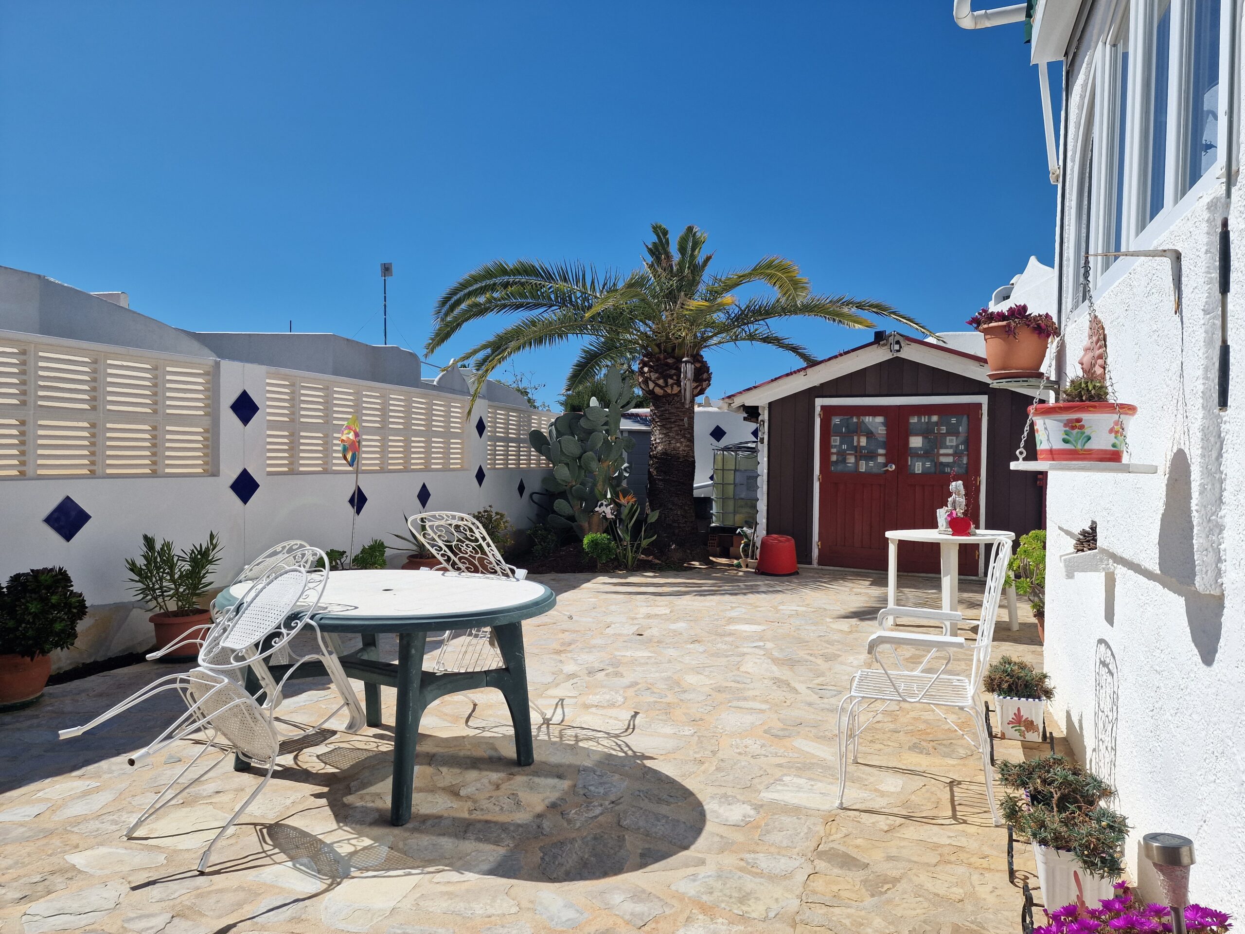 Buitenruimte met groot terras, bloembakken en overdekte parkeerplaats.